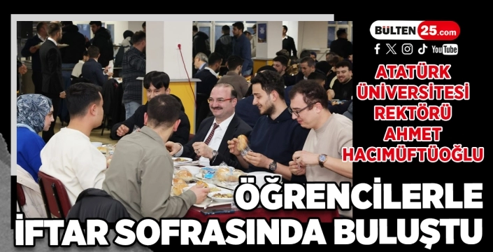Atatürk Üniversitesi Rektörü Prof. Dr. Ahmet Hacımüftüoğlu, Ramazan ayı dolayısıyla üniversite öğrencileriyle düzenlenen iftar programında bir araya geldi. Merkezi yemekhanede gerçekleştirilen programa yoğun katılım olurken birlik, beraberlik ve dayanışma mesajları ön plana çıktı.