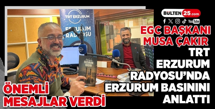 Erzurum Gazeteciler Cemiyeti Başkanı Mehmet Musa Çakır, TRT Erzurum Radyosu’nun program konuğu oldu. Selma Talar’ım hazırlayıp, Yıldıray Yıldız’ın sunduğu Bölge Gündemi programında; EGC yayınları arasında yer bulan “Anılarla Erzurum Basını” adlı kitabı anlatan Çakır, yanı sıra mesleki dayanışma, birlik ve beraberlik mesajları verdi. Yıldız’ın sorularını yanıtlayan EGC Başkanı Çakır, Erzurum basını tarifiyle büyük beğeni topladı. Erzurum basınının refleksi güçlü, hafızası diri ve memleketine karşı sorumluluk duygusu çok yüksek bir kimliğe sahip olduğunu belirten Çakır, “Farklı görüşler, farklı duruşlar elbette olacak, bu işin doğasında var. Ama Erzurum basınının ortak bir paydası var ki, o da şehre karşı duyulan sorumluluktur” diye konuştu.