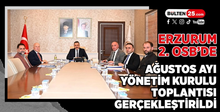 Erzurum Merkez 2. Organize Sanayi Bölgesi’nin (OSB) Ağustos Ayı Yönetim Kurulu Toplantısı, Erzurum Valisi Mustafa Çiftçi’nin başkanlığında Valilik Toplantı Salonu’nda gerçekleştirildi.