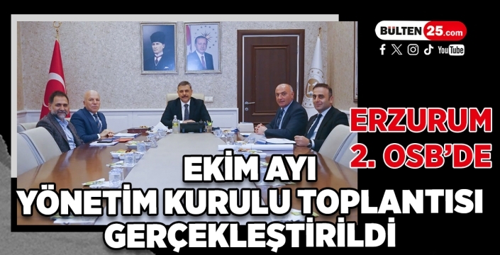 Erzurum Merkez 2. Organize Sanayi Bölgesi (OSB) Ekim Ayı 2. Yönetim Kurulu Toplantısı, Erzurum Valisi Mustafa Çiftçi’nin başkanlığında yapıldı. Toplantıda, bölge genelinde devam eden yatırım süreçleri ve altyapı projeleri masaya yatırıldı.