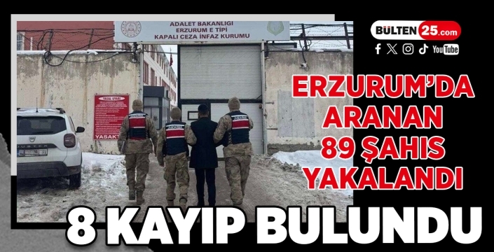 BÜLTEN25 / ERZURUM Erzurum İl Jandarma Komutanlığı ekipleri, Ocak 2026 döneminde suç ve suçlularla mücadele kapsamında yürüttüğü çalışmalarla önemli sonuçlar elde etti. 01-31 Ocak 2026 tarihleri arasında aranan şahısların yakalanmasına yönelik gerçekleştirilen faaliyetlerde toplam 89 kişi yakalandı.