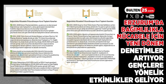 Erzurum Valiliği, bu kararlarla birlikte toplum sağlığını tehdit eden bağımlılıklara karşı daha etkin, kararlı ve katılımcı bir mücadele dönemine giriyor.