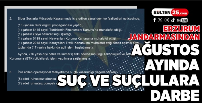 Erzurum İl Jandarma Komutanlığı, suç ve suçlularla mücadelenin kesintisiz süreceğini belirterek, “Halkımızın huzur ve güvenliği için çalışmalarımıza hız kesmeden devam edeceğiz” açıklamasında bulundu.
