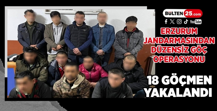 BÜLTEN25 / ERZURUM Erzurum İl Jandarma Komutanlığı'nın 04 Şubat 2026 tarihinde İspir ilçesi mülki sınırları içerisinde gerçekleştirdiği operasyonda, yurda yasa dışı yollarla girdiği tespit edilen 18 yabancı uyruklu şahıs yakalandı. Yakalanan düzensiz göçmenlere toplam 742 bin 338 TL idari para cezası uygulandı.