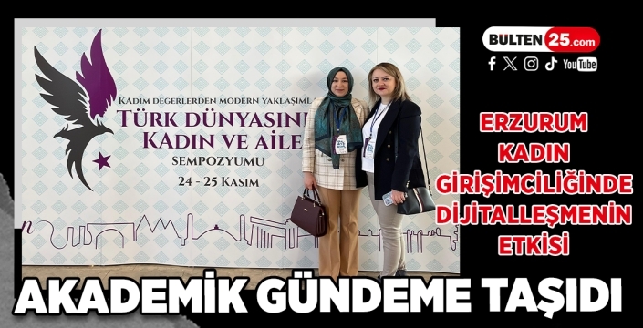 Erzurum’daki kadın girişimciler üzerine yapılan dijitalleşme araştırması, 24–25 Kasım tarihlerinde Erzincan’da düzenlenen Kadim Değerlerden Modern Yaklaşımlara Kadın ve Aile Sempozyumunda dikkatleri üzerine çekti. Prof. Dr. Dilşad Güzel ve Ayşegül Turan tarafından hazırlanan “Dijitalleşmenin Kadın Girişimciler Üzerindeki Etkisi: Erzurum İli Örneği” başlıklı çalışma, oturumda Prof. Dr. Dilşad Güzel tarafından sunuldu.