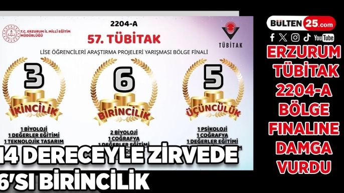 BÜLTEN25 / ERZURUM Erzurum’u temsil eden öğrenciler; 6 birincilik, 3 ikincilik ve 5 üçüncülük olmak üzere toplam 14 derece kazanarak bölge birincisi oldu ve önemli bir başarıya imza attı.