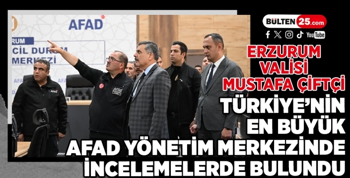 BÜLTEN 25 HABER – Erzurum Valisi Mustafa Çiftçi, yeni tamamlanan ve Türkiye’nin en büyük İl Afet ve Acil Durum Yönetim Merkezi (AADYM) olma özelliğine sahip tesiste incelemelerde bulundu. Erzurum İl Afet ve Acil Durum (AFAD) Müdürlüğü tarafından yürütülen çalışmaları yerinde değerlendiren Vali Çiftçi, AFAD İl Müdürü Selahattin Karslı’dan merkezle ilgili detaylı brifing aldı.