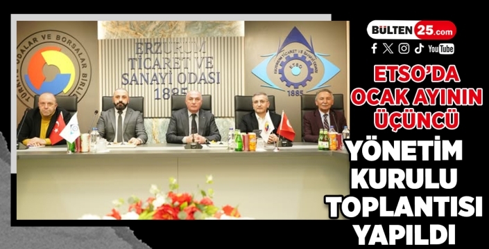 Erzurum Ticaret ve Sanayi Odası’nın (ETSO) Ocak ayının üçüncü haftasına ait olağan Yönetim Kurulu Toplantısı, TOBB Yönetim Kurulu Üyesi ve ETSO Yönetim Kurulu Başkanı Saim Özakalın başkanlığında gerçekleştirildi.