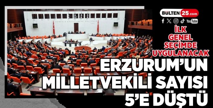 BÜLTEN25 / ERZURUM Yayımlanan karara göre Erzurum’un Türkiye Büyük Millet Meclisi’ndeki milletvekili sayısı 6’dan 5’e düşürüldü. Yeni dağılımın, yapılacak ilk genel seçimde uygulanacağı bildirildi.