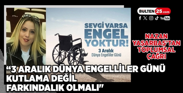 Birleşmiş Milletler tarafından ilan edilen 3 Aralık Dünya Engelliler Günü, engelli bireylere yönelik farkındalığı artırmayı amaçlasa da, Türkiye Otizm Meclisi Yönetim Kurulu Üyesi, Erzurum Palandöken Otizm Derneği ve Erzurum Otizm Spor Kulübü temsilcisi Nazan Yaşarbaş, bu günün “kutlanacak” değil, toplumsal sorunların hatırlatılması ve farkındalık oluşturulması gereken bir gün olduğunu vurguladı.