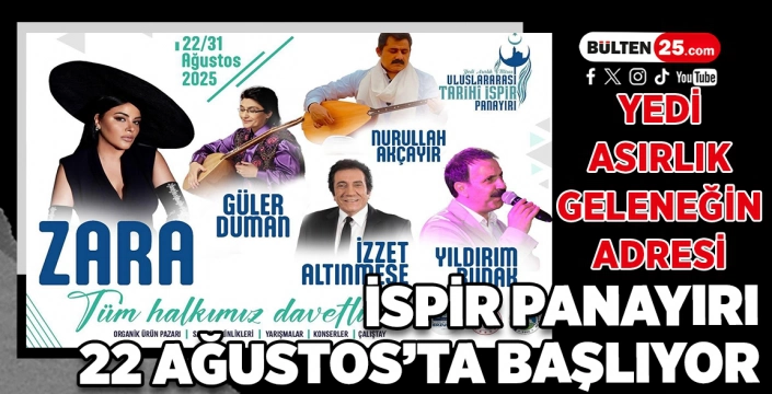 Yedi Asırlık Miras Tarihi İspir Panayırı, bu yıl 22-31 Ağustos tarihinde birbirinden ünlü sanatçıların katılımıyla yapılacak. İspir Belediyesi’nin ev sahipliğinde yapılacak festivalde bu sene ünlü sanatçı Zara ile birlikte İzzet Altınmeşe, Güler Duman, Nurullah Akçayır ve Yıldırım Budak sahne alacak.